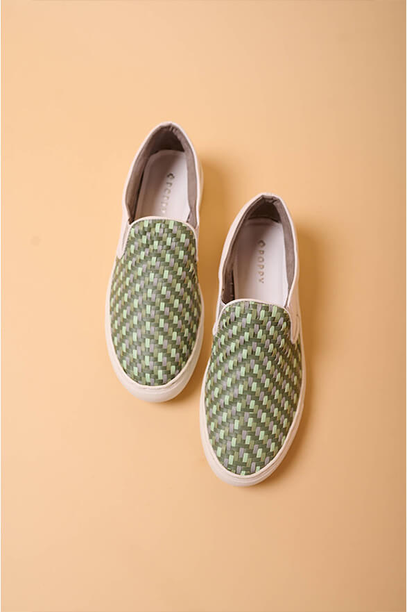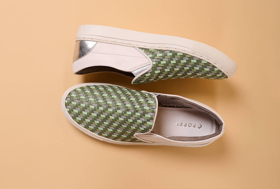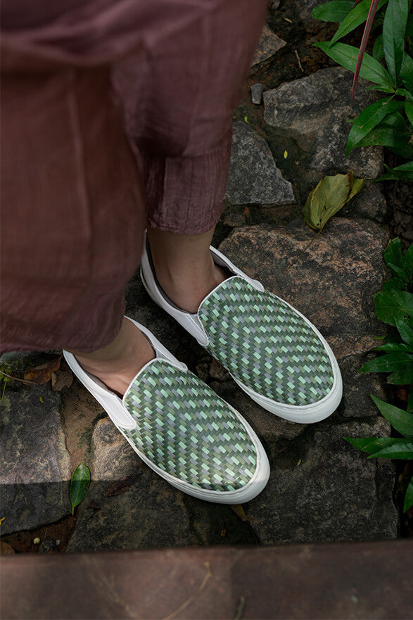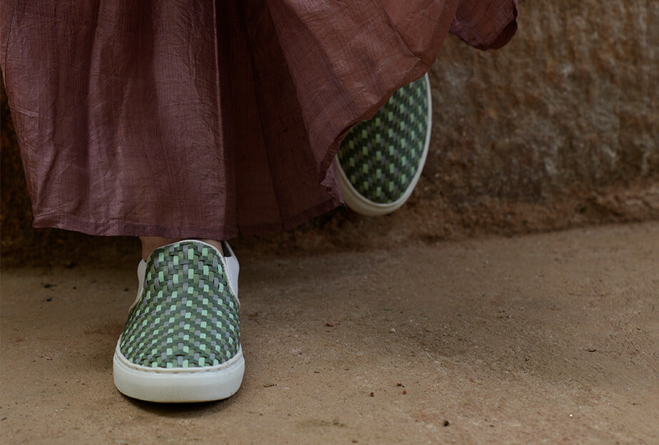 - Hand woven faux leather sneakers inspired by leheriya patterns, backed with soft cushioning on a sneaker sole with a 6mm padded insole, handcrafted for ultimate comfort