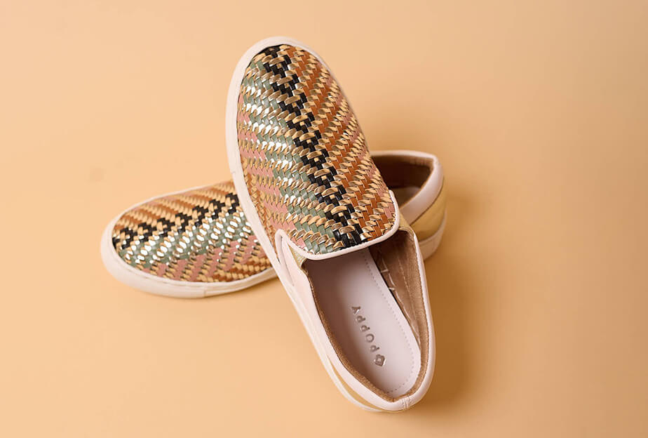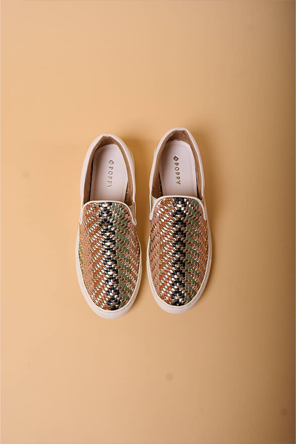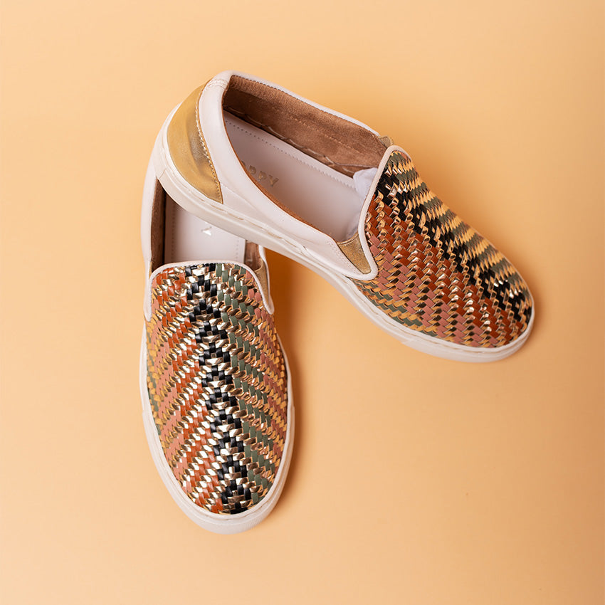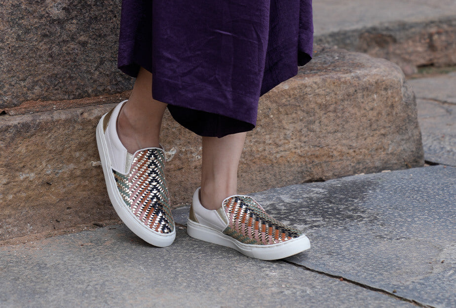 - Hand woven faux leather sneakers inspired by leheriya patterns, backed with soft cushioning on a sneaker sole with a 6mm padded insole, handcrafted for ultimate comfort