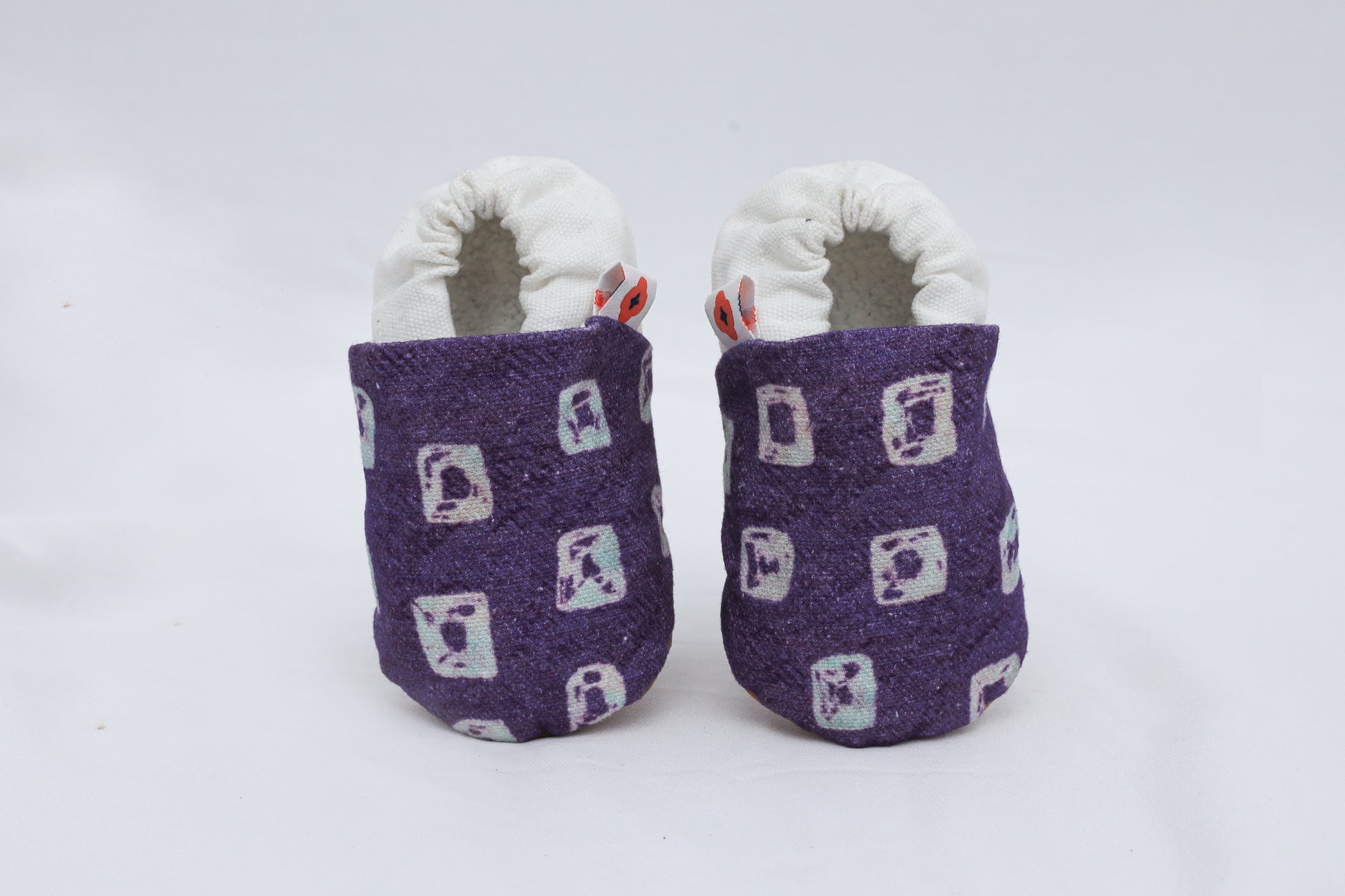 Colorful purple baby bandhani shoes with soft inside cushions, and comfortable elastic bands